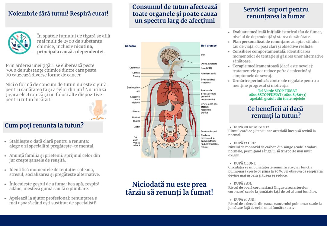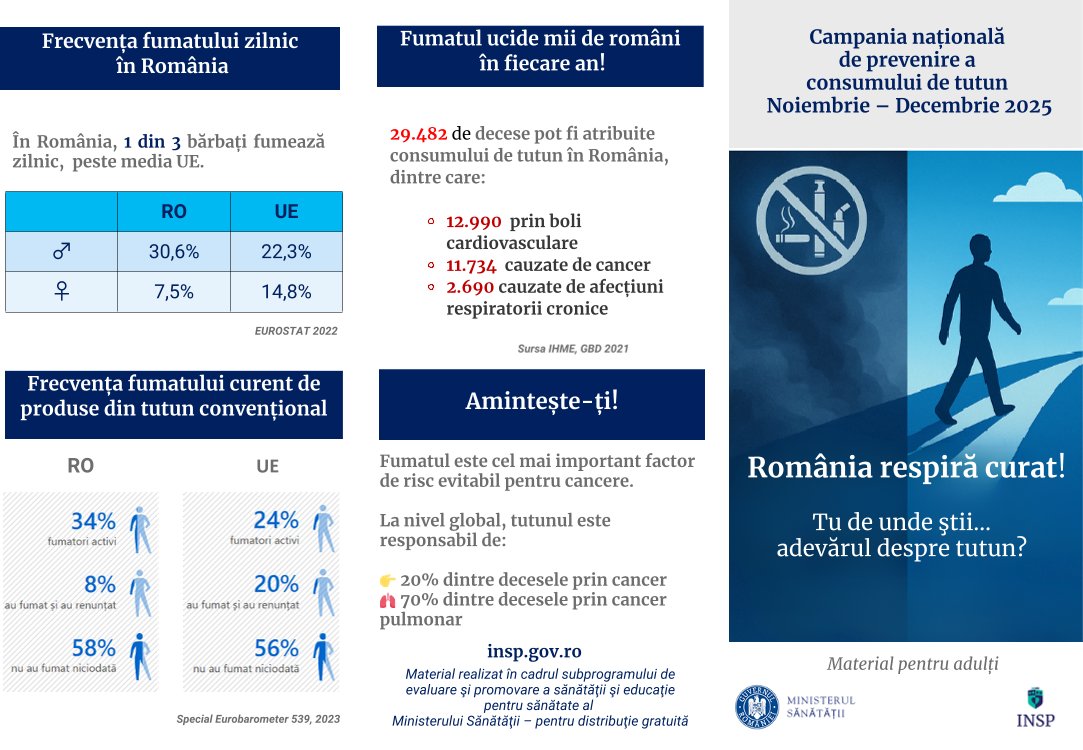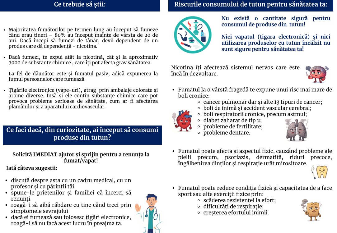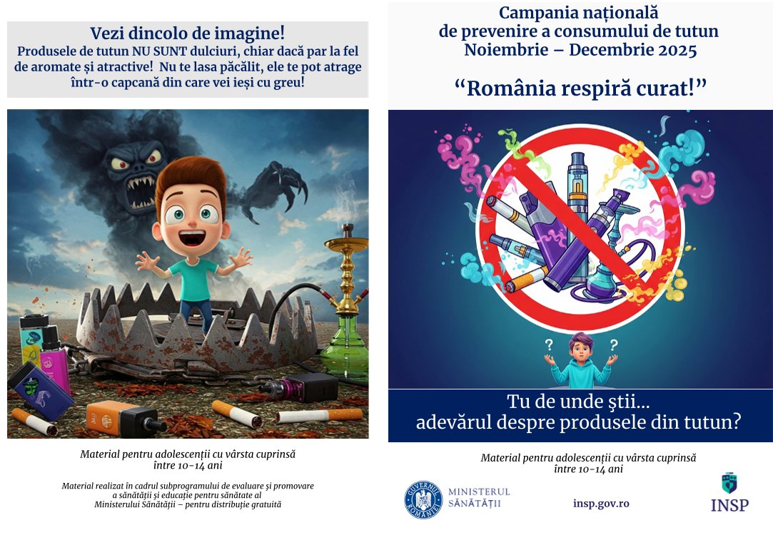 În acest context, Institutul Național de Sănătate Publică, alături de Colegiul Medicilor Stomatologi și direcțiile de sănătate publică, desfășoară la nivel național, în perioada noiembrie – decembrie 2025, campania de prevenire a consumului de tutun, care are ca scop informarea și conștientizarea adolescenților despre impactul nociv al fumatului.