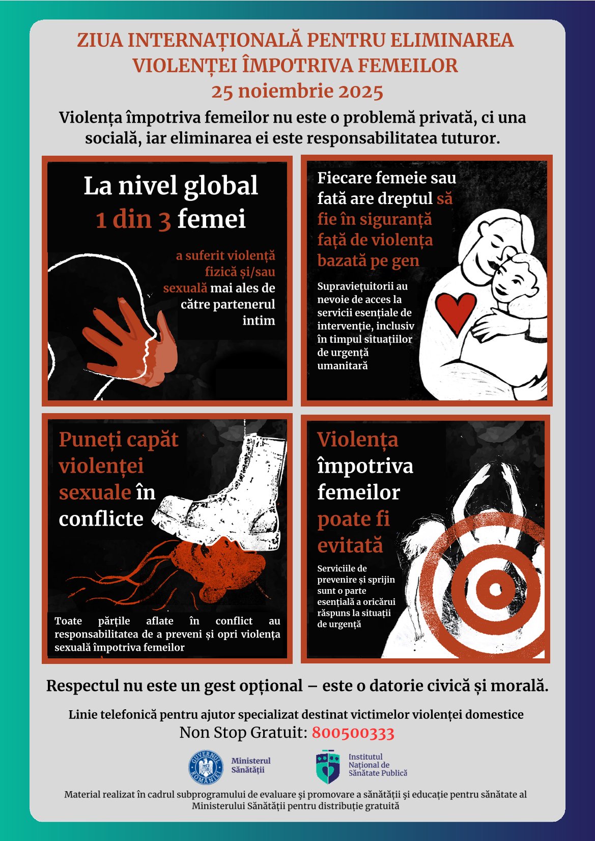 Ziua Internațională pentru Eliminarea Violenței împotriva Femeilor, marcată anual la 25 noiembrie, reprezintă un moment de reflecție și mobilizare globală împotriva tuturor formelor de violență de gen. Aceasta constituie o problemă complexă, cu impact direct asupra drepturilor fundamentale ale omului și sănătății publice. Inițiată de Organizația Națiunilor Unite (ONU) în 1999 această zi atrage atenția asupra diversității formelor de violență și subliniază importanța implementării de politici eficiente pentru prevenire, protecție și sprijinirea victimelor (United Nations, 2023).